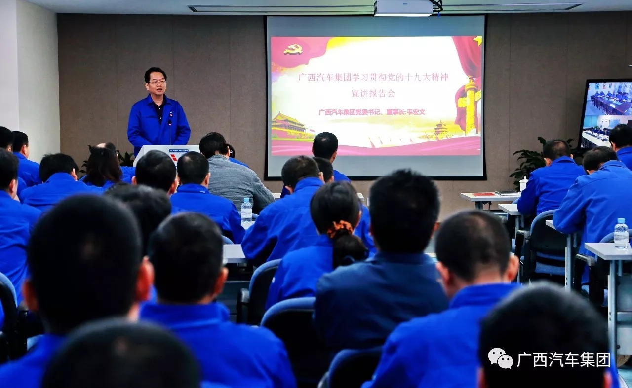 為深入學(xué)習(xí)貫徹黨的十九大精神,?12月6日,廣西汽車集團(tuán)舉行學(xué)習(xí)貫徹黨的十九大精神宣講報(bào)告會(huì),廣西汽車集團(tuán)黨委書記、董事長(zhǎng)韋宏文在會(huì)上作題為《新時(shí)代·新氣象·新作為》宣講報(bào)告。集團(tuán)公司黨委領(lǐng)導(dǎo)、各級(jí)黨組織書記、一級(jí)經(jīng)理、所屬企業(yè)負(fù)責(zé)人等一百多人現(xiàn)場(chǎng)聆聽了報(bào)告,山東、重慶、桂客等單位以視頻形式參加報(bào)告會(huì)。